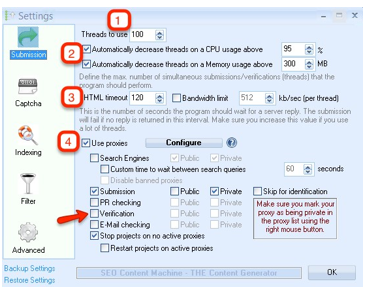 3. Sử dụng các proxy chỉ cho xây dựng liên kết: Bạn chỉ cần proxy để tạo backlinks, nhưng không có gì khác. Nhấn vào Options → Nộp và bỏ chọn "Xác nhận".
