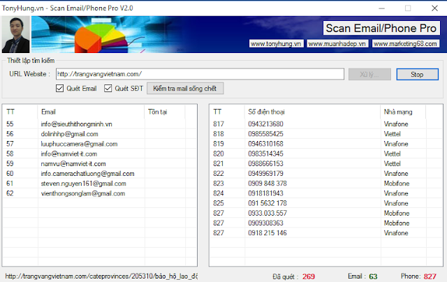 Đầu tiên là bộ công cụ hỗ trợ quét email, số điện thoại từ website.