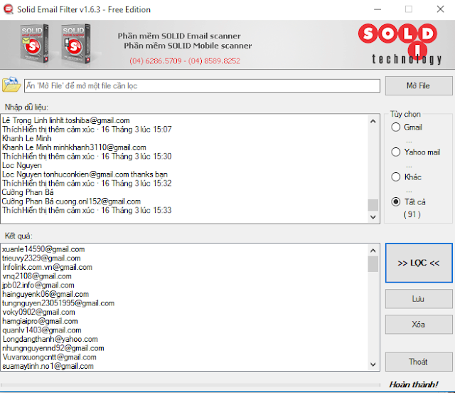 - Hỗ trợ quét email từ comment trên facebook.- Công cụ này hỗ trợ khá tốt việc get email từ comment từ facebook, nhưng có 1 nhược điểm là với những bài nhiều comment thì sẽ mất chút thời gian vì cần phải copy hết những comment đó thì mới lọc được, cũng có 1 số công cụ hỗ trợ quét comment nhưng sau cùng vẫn phải dùng đến Solid email filter để lọc ra email. (với đa số những tool free sẽ phải làm thủ công 1 chút).