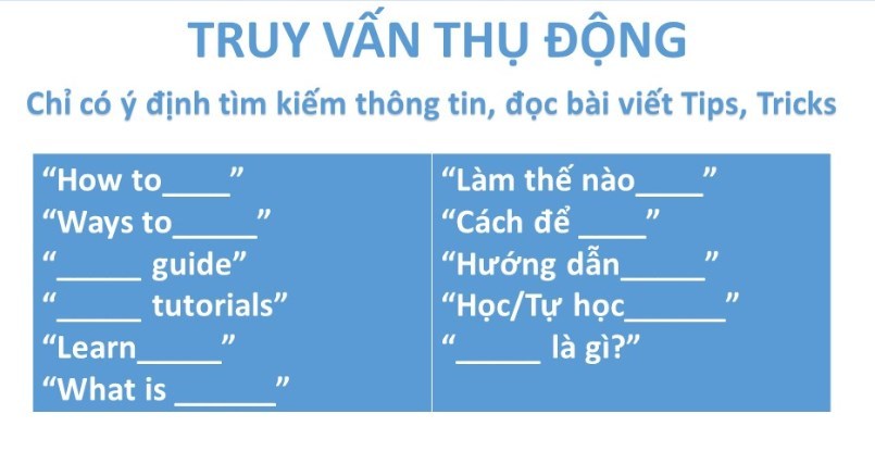 Mình sẽ liệt kê ra những dạng từ khóa đi kèm với từ khóa chính trong truy vấn tìm kiếm của người dùng với cả 2 trường hợp Chủ động và Thụ động để bạn có thể phân tích được khách hàng của mình.