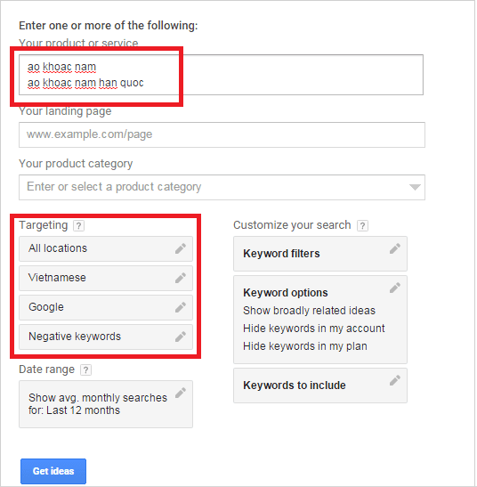+ Your product or service : điền 1 vài từ khóa mà bạn nghĩ ra trước đó.