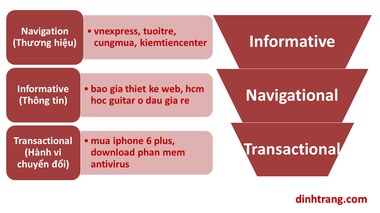 Chúng ta sẽ đánh giá độ khó của từ khóa thông qua tỷ lệ chuyển đổi của nó. Tỷ lệ chuyển đổi của từ khóa mình đã giải thích ở bài viết trước , nếu bạn chưa nắm vững hãy đọc lại lần nữa. Mỗi một từ khóa được search ở ô tìm kiếm mang một mục đích khác nhau. Tại đây mình muốn bổ sung một chút về kiến thức từ khóa cho bạn.